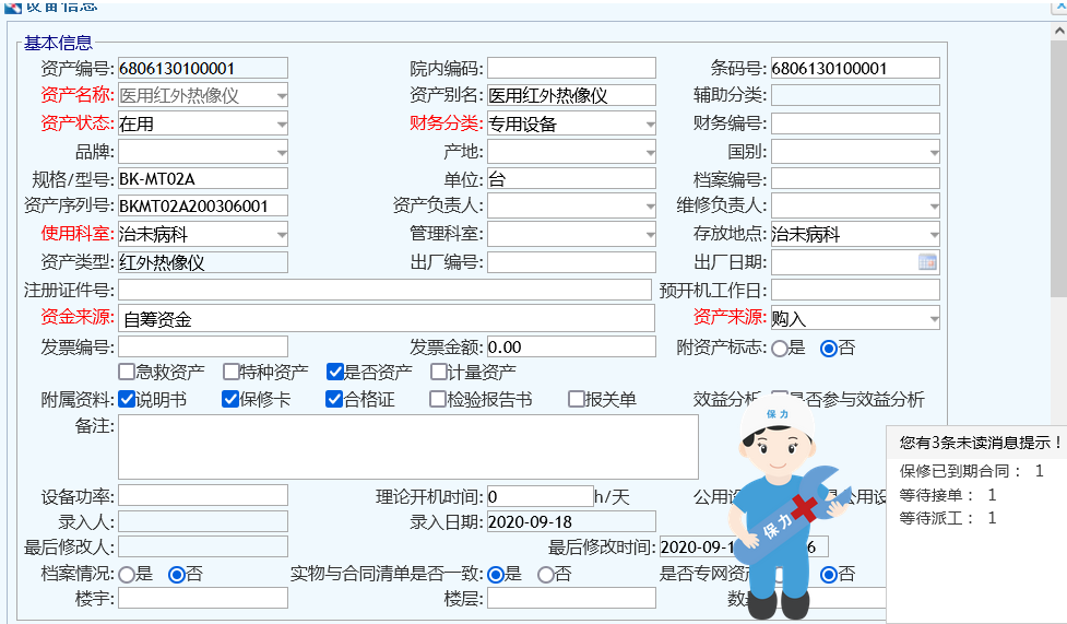 医院采购新设备之后,入库时往往要考虑到后续的一些保养维修,所以在入库时就需要吧相关的信息完善好,方便后续的管理。