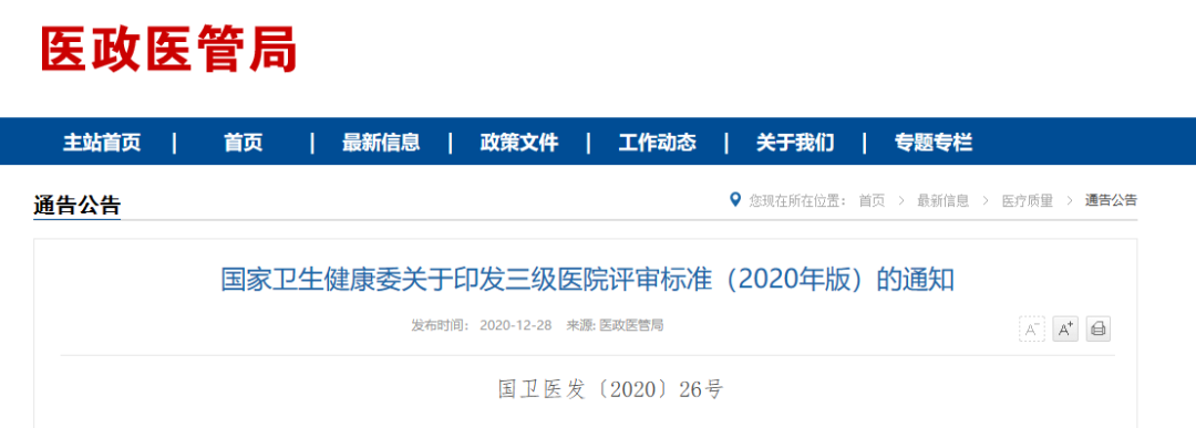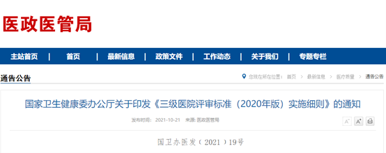 2021年10月21日,为指导各地充分理解和掌握《标准》,运用《标准》做好医院评审工作,指导医院利用《标准》加强日常管理,国家卫生健康委印发了《三级医院评审标准(2020年版)实施细则》(以下简称《细则》)。《细则》是评审标准配套文件,《细则》是对《标准》的解读和细化,是各地开展医院评审工作和医院加强自身管理的重要依据,明确表示各省级卫生健康行政部门可根据当前工作重点,结合本地特点对《细则》进行调整并参照使用。