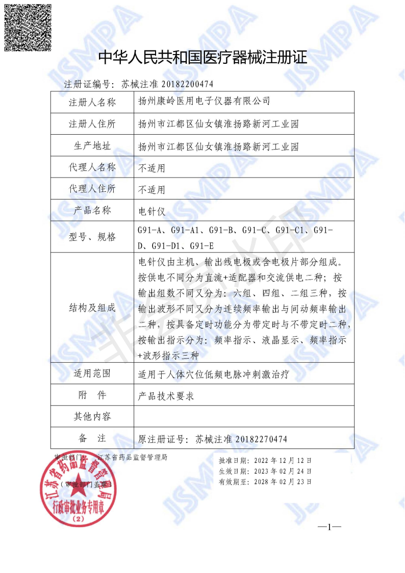 G91-A型电针仪是将现代的电子脉冲技术和传统的针灸经络学说相结合的一种新型电子医疗仪器,理念是通过脉动电流取代人工捻转提高针灸疗效的目的。具有使用安全可靠、操作方便等特点,属于Ⅱ类医疗器械。