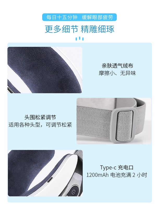 智能眼部按摩仪:护眼新姿势·开启“睛”彩视界,每日十五分钟,缓解眼部疲劳。匠心工艺·精雕细琢,四种模式、助眠音乐、超长续航、智能加热、一键开机···
