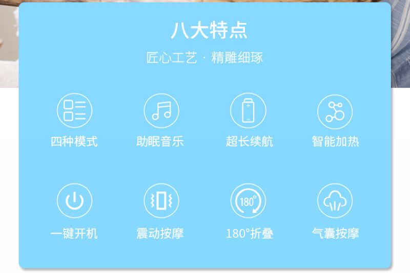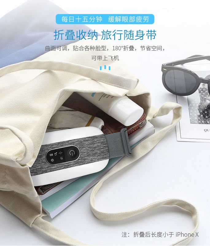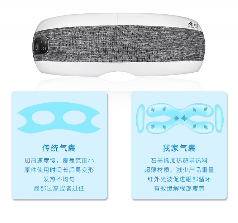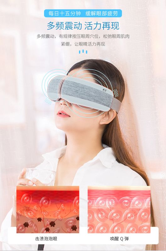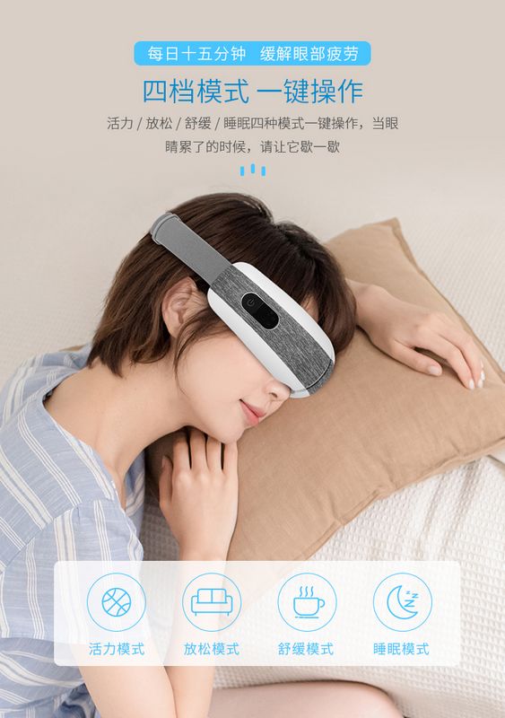智能眼部按摩仪:护眼新姿势·开启“睛”彩视界,每日十五分钟,缓解眼部疲劳。匠心工艺·精雕细琢,四种模式、助眠音乐、超长续航、智能加热、一键开机、震动按摩、180°折叠、气囊按摩等功效。